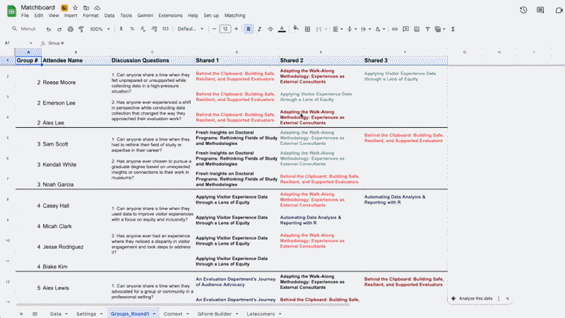 It will generate a fresh set of groups while avoiding any “you’ve already met” duplicates—so each round maximizes new connections. (Note that “Reese Moore” is now with two new conversation partners.)